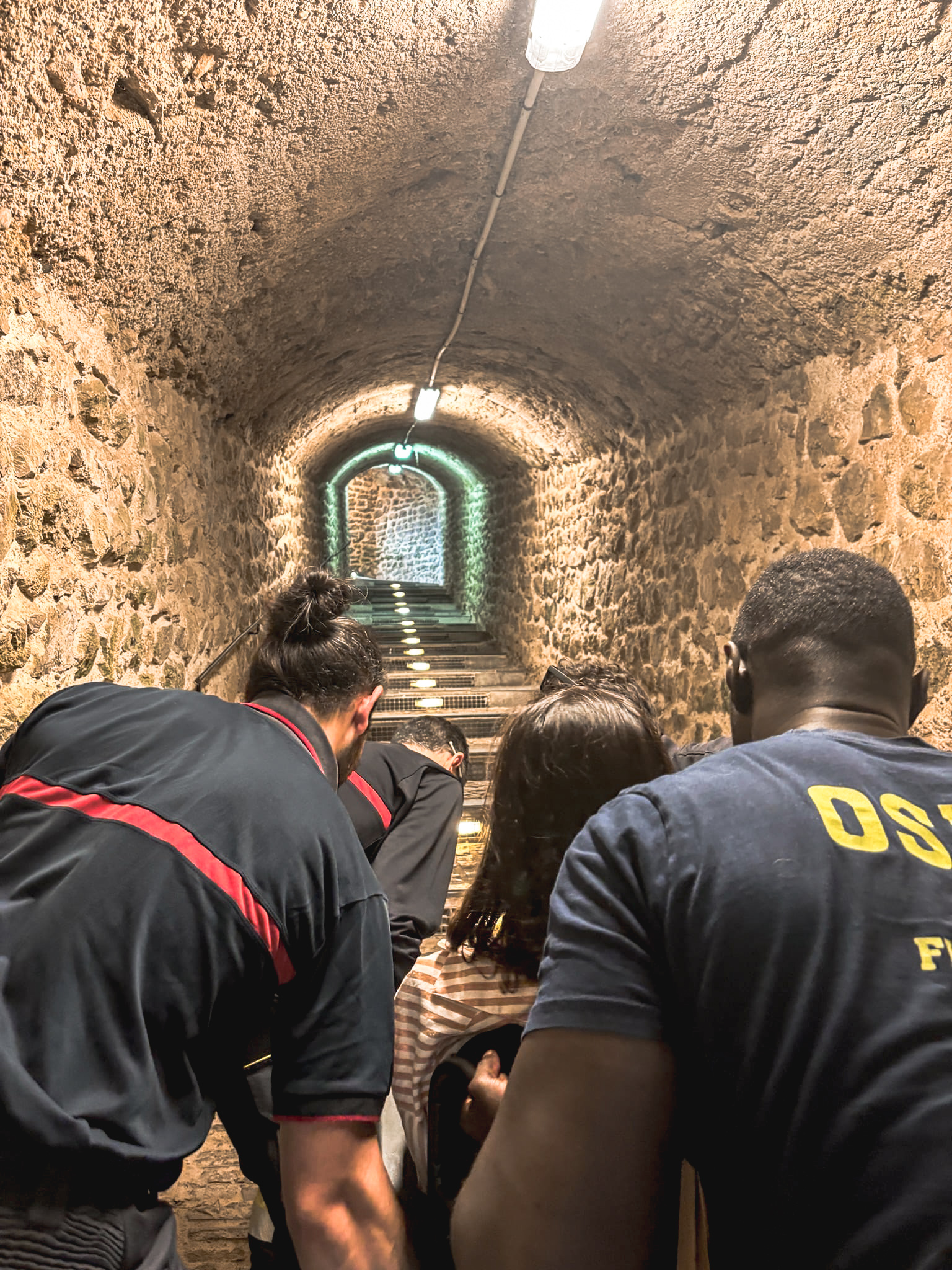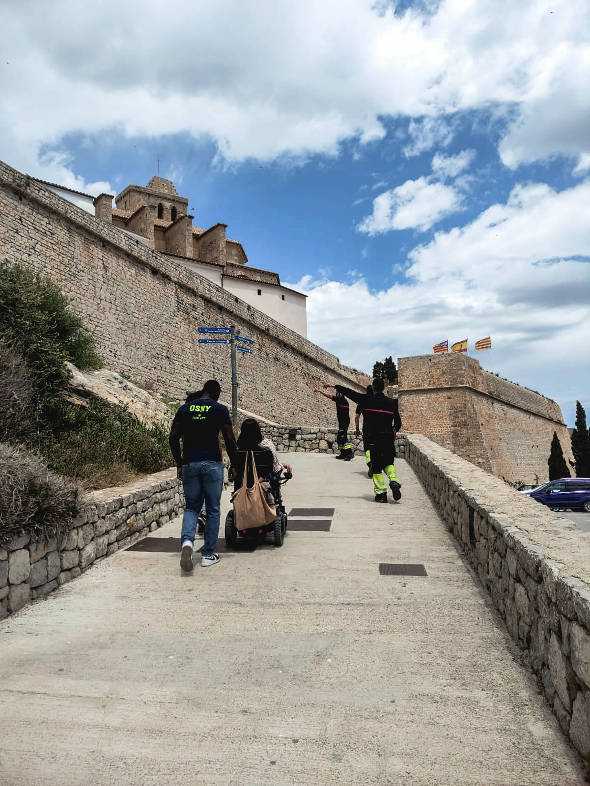 Nous avons voulu aller à pied jusqu’à Dalt Vila qui est le cœur historique et la vieille ville d’Eivissa. Les murailles de la cité fortifiée sont classées au patrimoine mondial de l’UNESCO. Il y a plusieurs moyens de franchir ces remparts et je n’avais pas fait de recherches au préalable sur l’accessibilité. Nous avons pris la route principale qui monte jusqu’à un parking situé en hauteur derrière la cathédrale en pensant que si une voiture pouvait s’y rendre, je pourrais aussi. La vue est magnifique, mais le problème c’est qu’à cet endroit il y a une dizaine de marches à franchir puis il y a le bastion de Sant Bernat à emprunter qui comporte de nombreuses marches espacées. On étaient frustrés de devoir tout redescendre pour prendre une autre entrée, alors on a demandé à des pompiers qui étaient là s’ils pouvaient nous aider à me porter. Ils ont accepté mais mes amis et eux en ont chié (près de 150 kgs pour mon fauteuil et moi) ! Ils ont été adorables et grâce à eux, on a pu rejoindre la place de la Cathédrale de Santa María La Mayor qui est très mignonne. On a ensuite parcouru les ruelles très charmantes, mais ça descend assez fortement par endroit avec des pavés glissants. On a bu un verre au soleil avant de sortir par un bastion accessible en contrebas. Donc un conseil, regardez bien un plan pour accéder à Dalt Vila par les chemins accessibles.