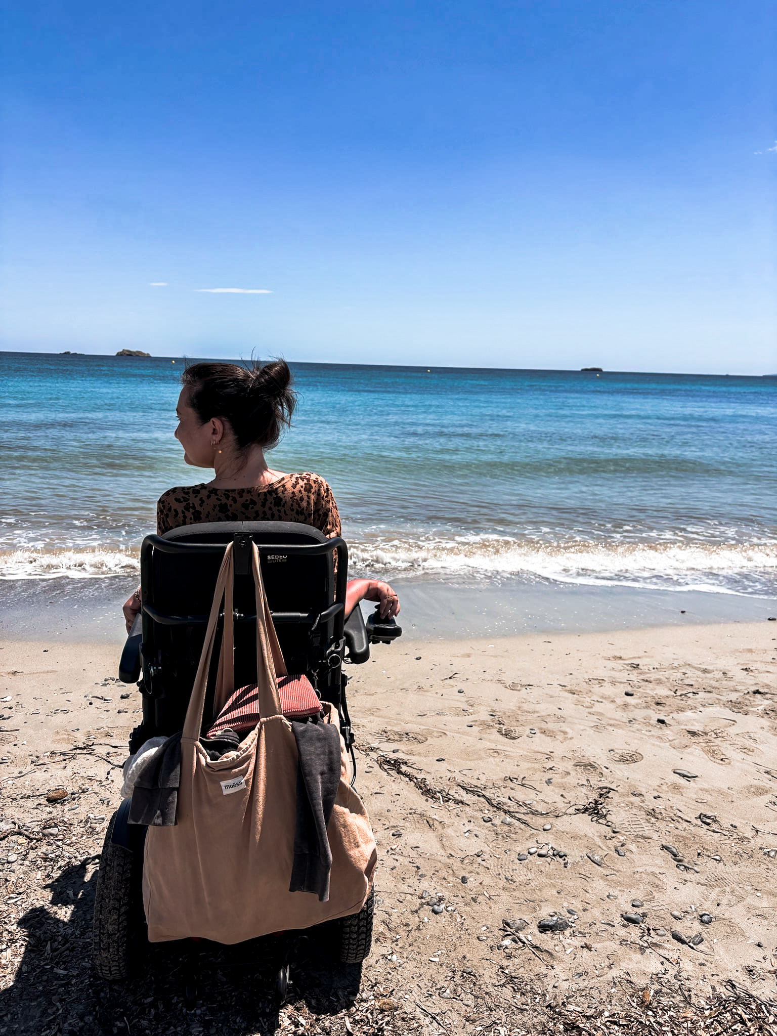 - Sunset Ashram : c’est pour moi la plus belle plage qu’on ait faite, l’eau est magnifique avec des nuances de bleu que j’adore. Il y a un premier parking public à quelques centaines de mètres mais on peut accéder avec la carte de stationnement PMR au deuxième parking qui se situe juste à côté d’un restaurant et d’une petite boutique (tous les deux accessibles). On arrive en hauteur, ce qui fait qu’on surplombe la mer avec un point de vue superbe. Il y a des marches pour accéder à la plage, mais je n’ai pas fait attention si on peut y accéder de l’autre côté du bâtiment (il me semble qu’il y a une possibilité).