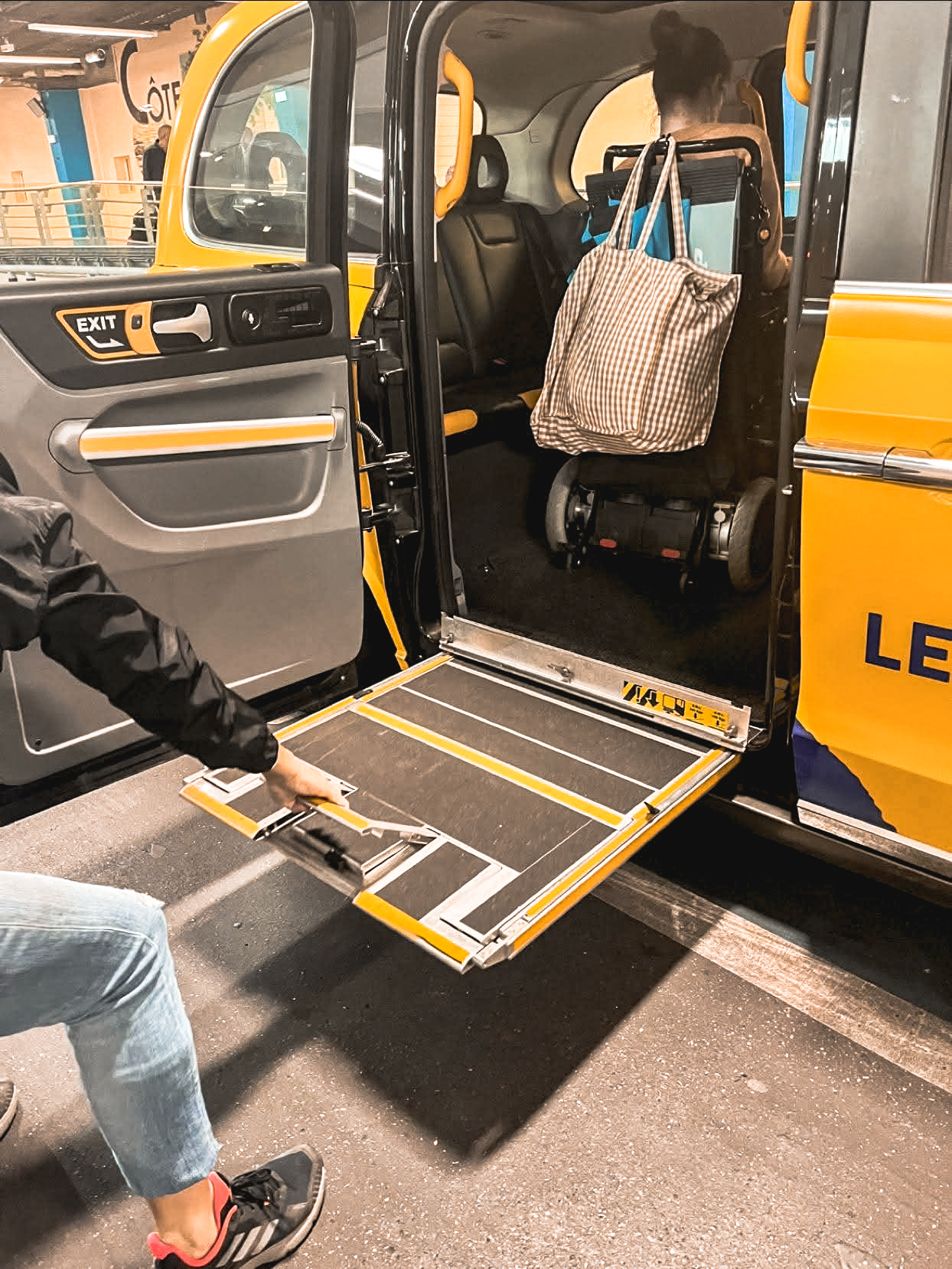 Entre Toulouse et Paris, on a pris le TGV. Ce qui était contraignant, c’est qu’il fallait changer de gare à Paris. Comme on n’avait pas beaucoup de temps de correspondance et que les transports en commun ne sont pas pratique en fauteuil roulant, on avait réservé un taxi adapté PMR avec l’application Caocao. Le véhicule ressemble à un cab londonien avec une rampe latérale (cf. photo) et c’est assez grand à l’intérieur mais un peu juste au niveau du toit si on a un grand fauteuil roulant électrique.
